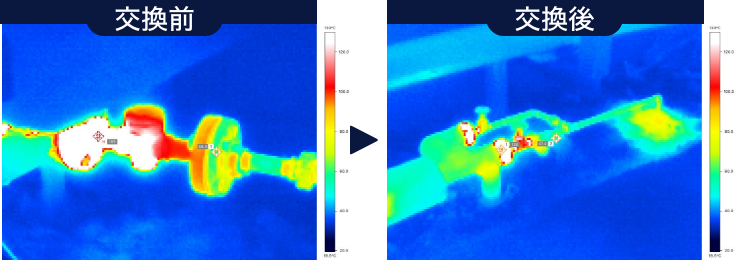 サーモカメラを用いて、既設トラップの一次側と二次側での温度測定を行い、スチームトラップが正常に稼働しているかを確認します。