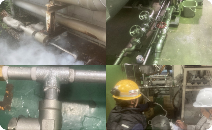 サーモカメラを用いて、既設トラップの一次側と二次側での温度測定を行い、スチームトラップが正常に稼働しているかを確認します。