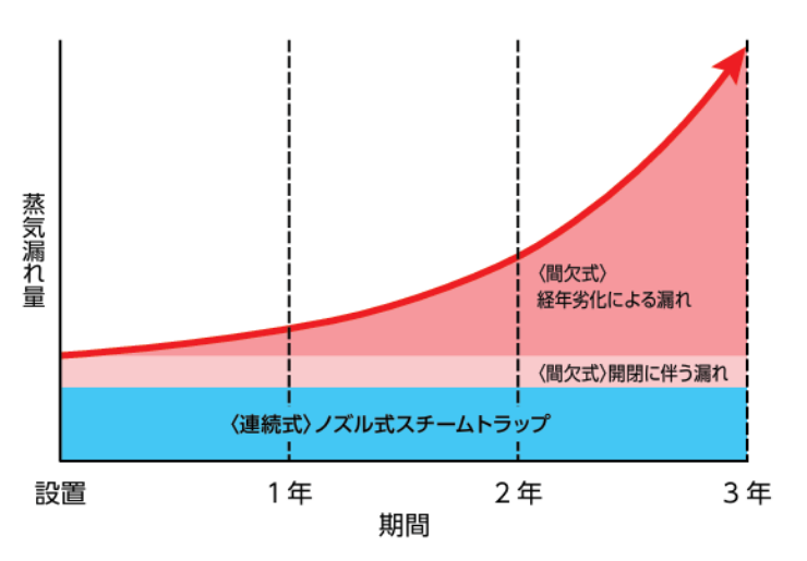 間欠式スチームトラップは、凝縮水の排出弁開閉により、継続的な蒸気漏れが発生します 。加えて、可動部分の劣化(シール性の低下)により、経年によっても蒸気が漏出します。その結果、故障が無いように見えても、実は多大なエネルギーロスが発生している場合があります。