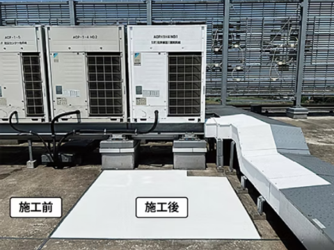 室外機及び周辺に、遮熱断熱コートをコートすることで 太陽熱を反射、断熱でき、屋上室外機の周辺温度が低下して室外機の吸い込み空気温度が下がります。結果、コンプレッサーへの負荷が少なくなり15%以上の省エネになります。