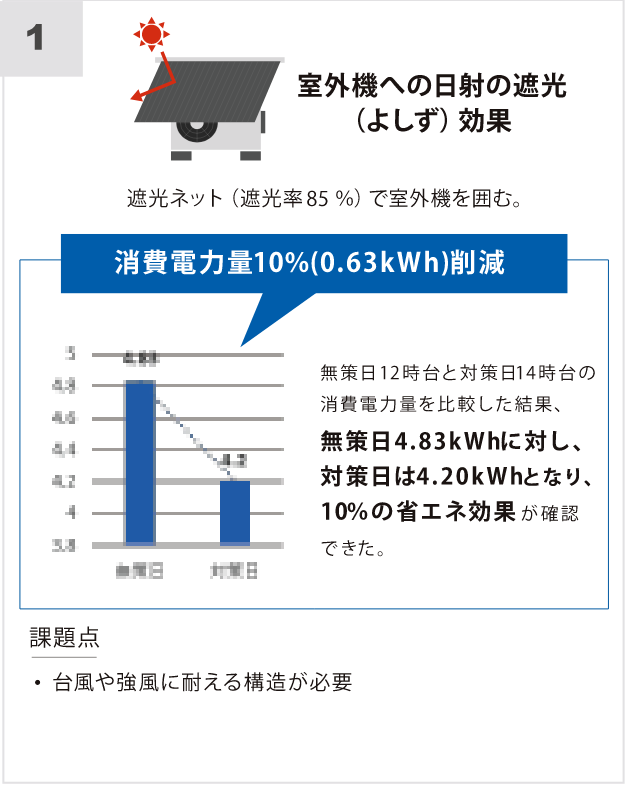 夏の直射日光があたる室外機及び周辺は、太陽熱で吸い込み口の空気温度が高く、また、室外機自体が熱を持つため、コンプレッサーに過度の負荷がか かります。電気を余計に消費します。