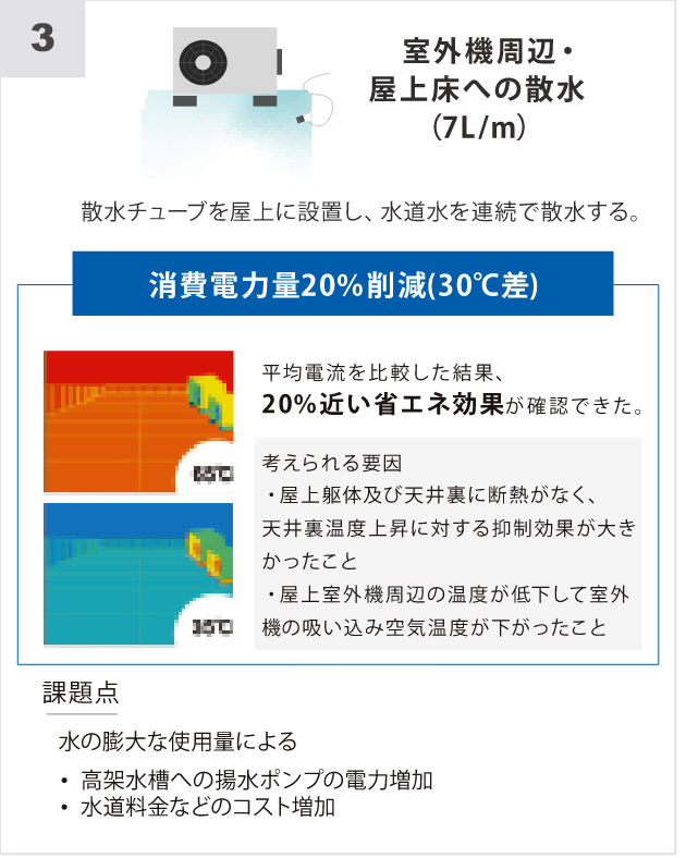 室外機の電力と電流及び吸い込み空気温度・室外機の電流・屋上及び天井裏の温度を1分間隔で計測。また赤外線サーモグラフィを使い、日により室外機及び、屋上床面の温度分布を測定。