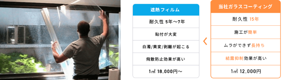 | (3)遮熱フィルム | 18,000円/㎡~ | (4)他社ガラスコーティング | 18,000円/㎡~ |